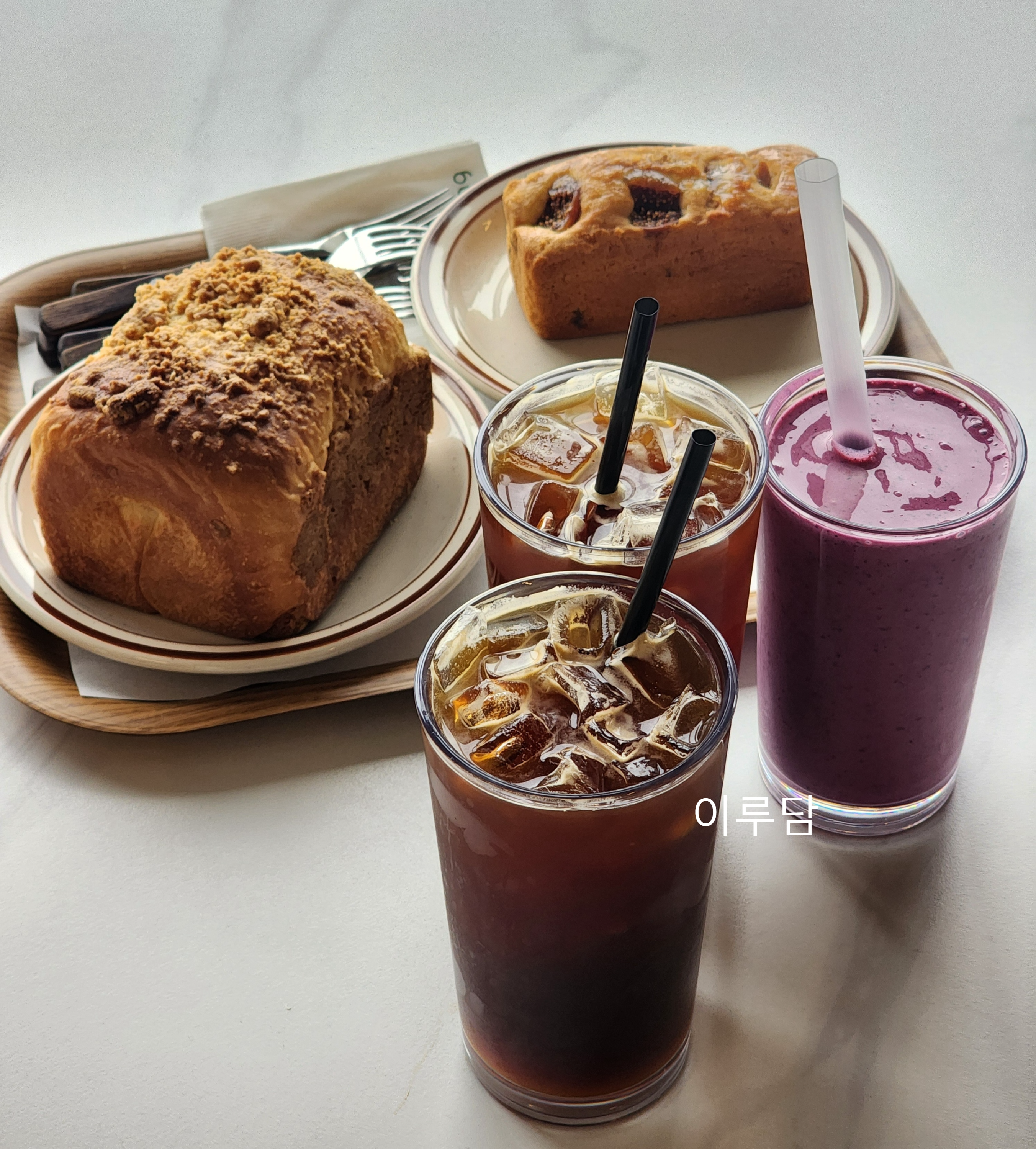 안녕하세요. 이루담이에요.:)삼랑진역 근처 카페삼랑에 다녀온 후기예요.오전 10시 영업시작이지만오전 9시 45분즈음,오픈런보다도 그 전에 밀양 삼랑진 카페에 도착하게 되었는데오픈시간 전인데도 반갑게 맞이하여 주셔서감사하고, 또 기분 좋은 방문의 시작이 되었답니다. 우리는 카페삼랑 빵 디저트, 베이커리 중에서초코마카롱, 딸기마카롱,무화과파운드, 통밤식빵을 골라 주문하고, 음료는 블루베리요거트스무디,커피는 아이스 아메리카노로 주문했어요. 비주얼만큼 다 맛있었던 카페메뉴와 카페삼랑빵 종류들. 통밤식빵 단면보세요. 대박이지 않나요.:)통밤이 가득가득 들어있어서 씹는 식감과 밤 자체의 달콤한 맛도정말 맛있었던 통밤식빵이에요. 카페삼랑 빵 베이커리 종류 우리가 오픈시간보다 일찍 도착했다고 했잖아요.그런데도 ..